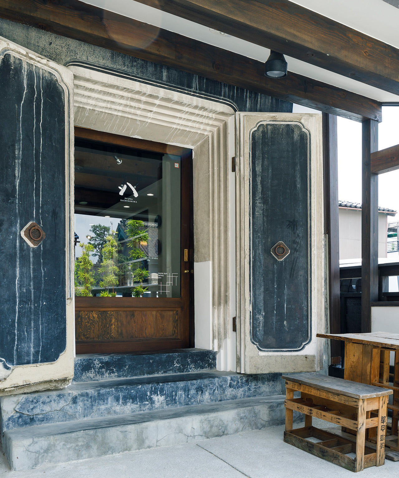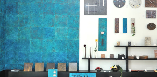 Orii gallery Hachinokura, located inside Yamacho Valley in the earthen storehouse district of Takaoka, is a vibrant space with blue copper plates spread all over.。